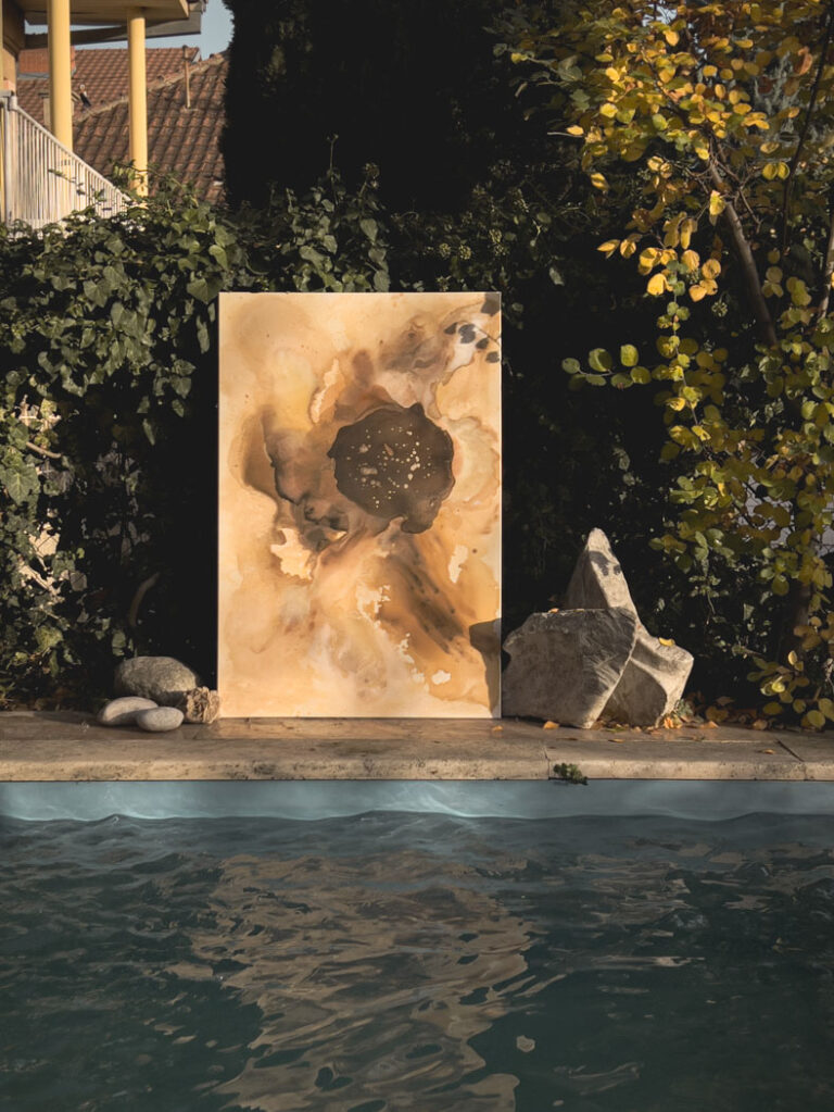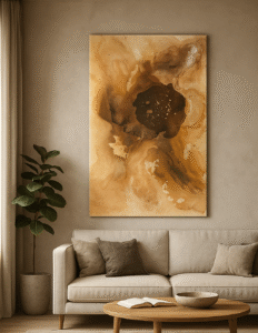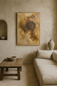 This painting opens a passage toward the first point of existence — a dark center that pulses like a primordial memory. Around it, the earthy tones shift like layers forming and unforming, creating an organic rhythm reminiscent of the very first breath.