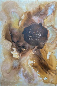 Kjo pikturë hap një portë drejt pikës së parë të ekzistencës — një qendër e errët që pulson si një kujtim primar. Rreth saj, ngjyrat e tokës lëvizin si shtresa që formohen e ç’formohen, duke krijuar një ritëm organik që i ngjan frymës së parë.