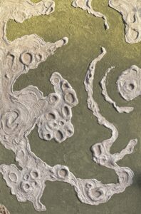 “Toka që kujton” shfaqet si materie që mban energjinë dhe ruan gjithçka – shprehitë, kujtimet, lëvizjet tona më të vogla. Relievi i saj duket si lëvizje e paprekshme që del në sipërfaqe prej rrënjëve për të na kujtuar se gjithçka që jemi, buron prej saj. Prandaj formimi i materies bëhet kur “vendos” vetë formën e saj.